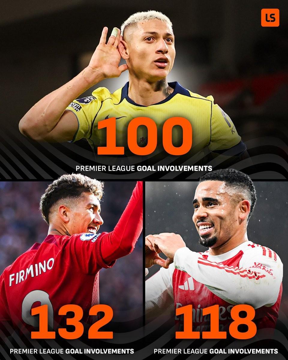 据统计,里沙利松成为第三位参与英超百球的巴西球员,前两位是菲尔米诺(参与132球)、热苏斯(参与118球)。